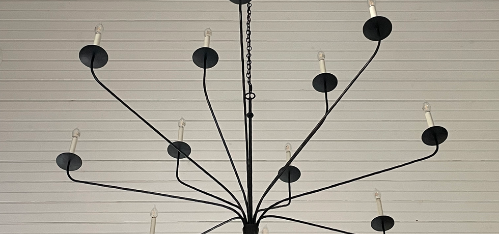 Window treatments were crafted with precision: ochre drapery with butterfly pleats, edged in trim from Texture Fabrics, hung from matte black French return rods — a quiet luxury that echoed the home’s hardware and architectural lines. A 65" tiered iron chandelier commands the ceiling with its sculptural silhouette, anchoring the room while coordinating seamlessly with the rest of the metalwork.